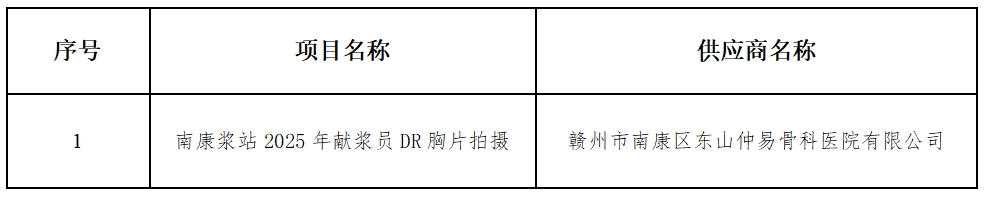 南康浆站2025年献浆员DR胸片拍摄项目(项目编号: CRBYFZ-NK-2024-03 )已经完成评审工作,现将成交结果公告如下: